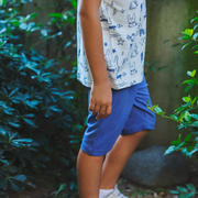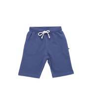 Slightly long, bermuda style shorts with side pockets and an elastic waistband with cotton drawstring.
