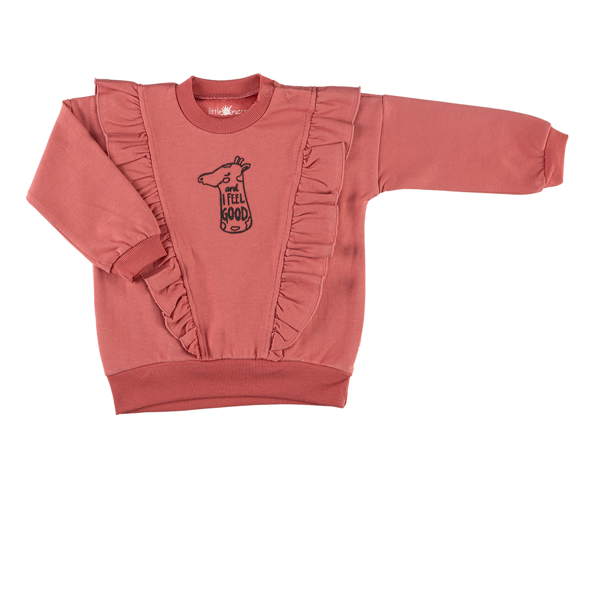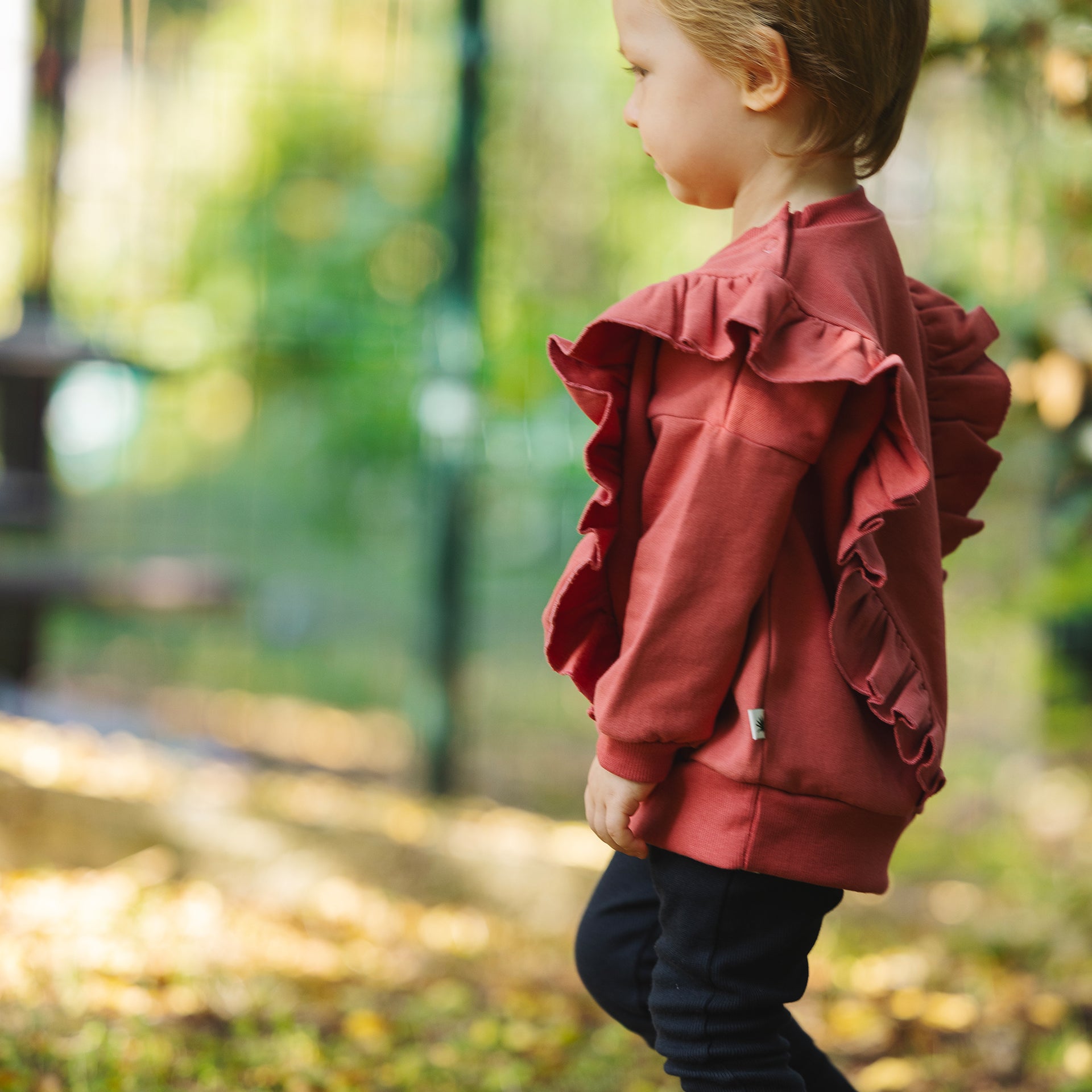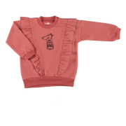 Loose cut sweatshirt with frills details over shoulders. There’s an embroidery on the chest.
