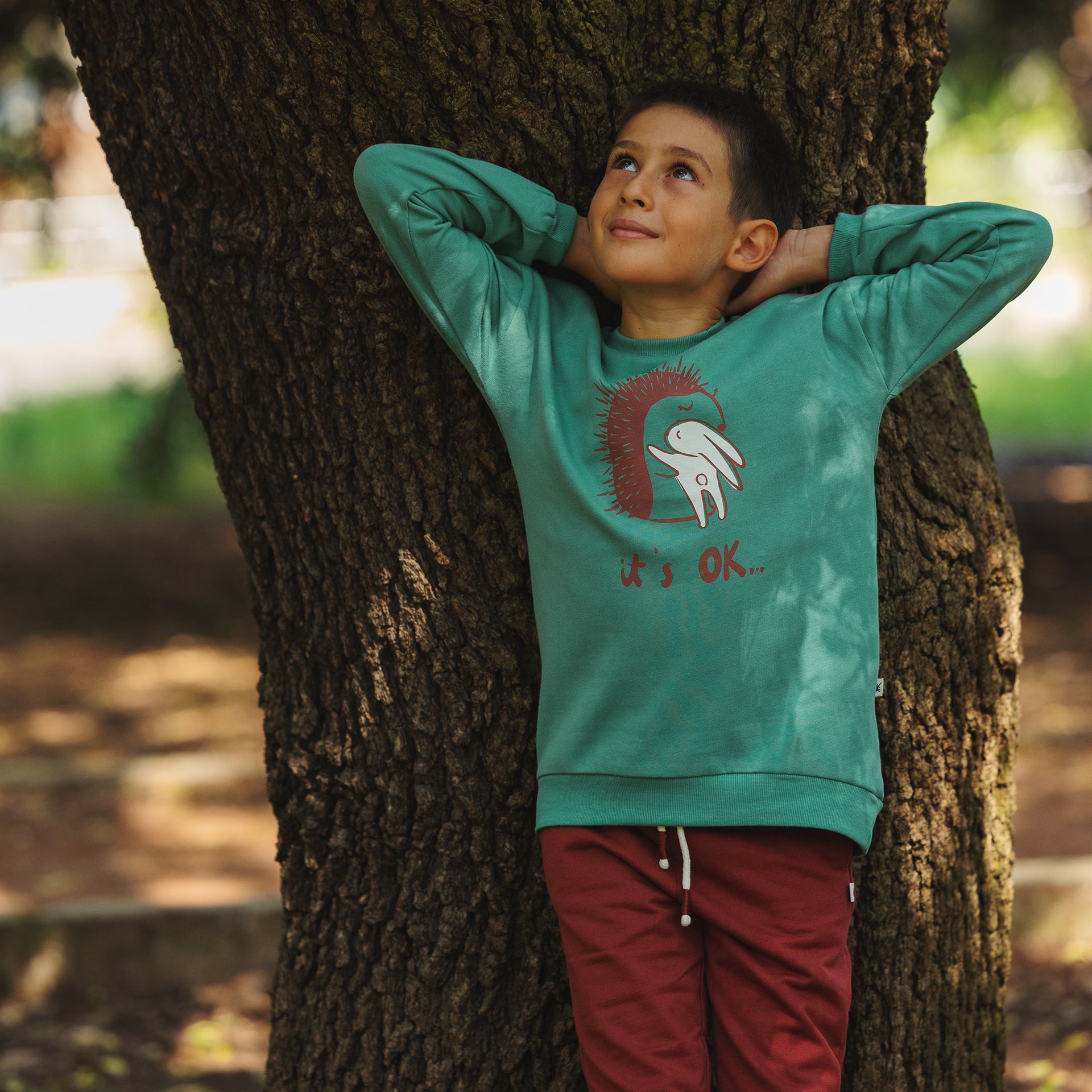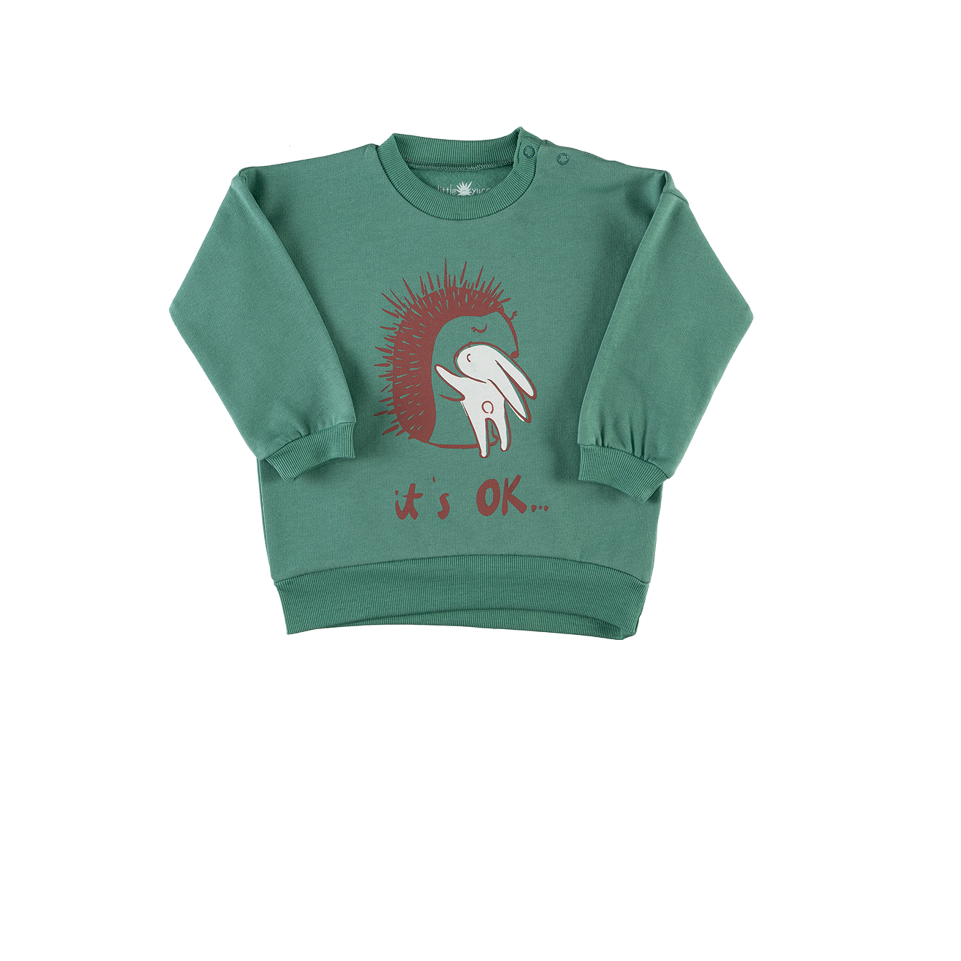 Loose cut sweatshirt with rib details. Sizes up to 3 years have snaps on the shoulder for easy dressing