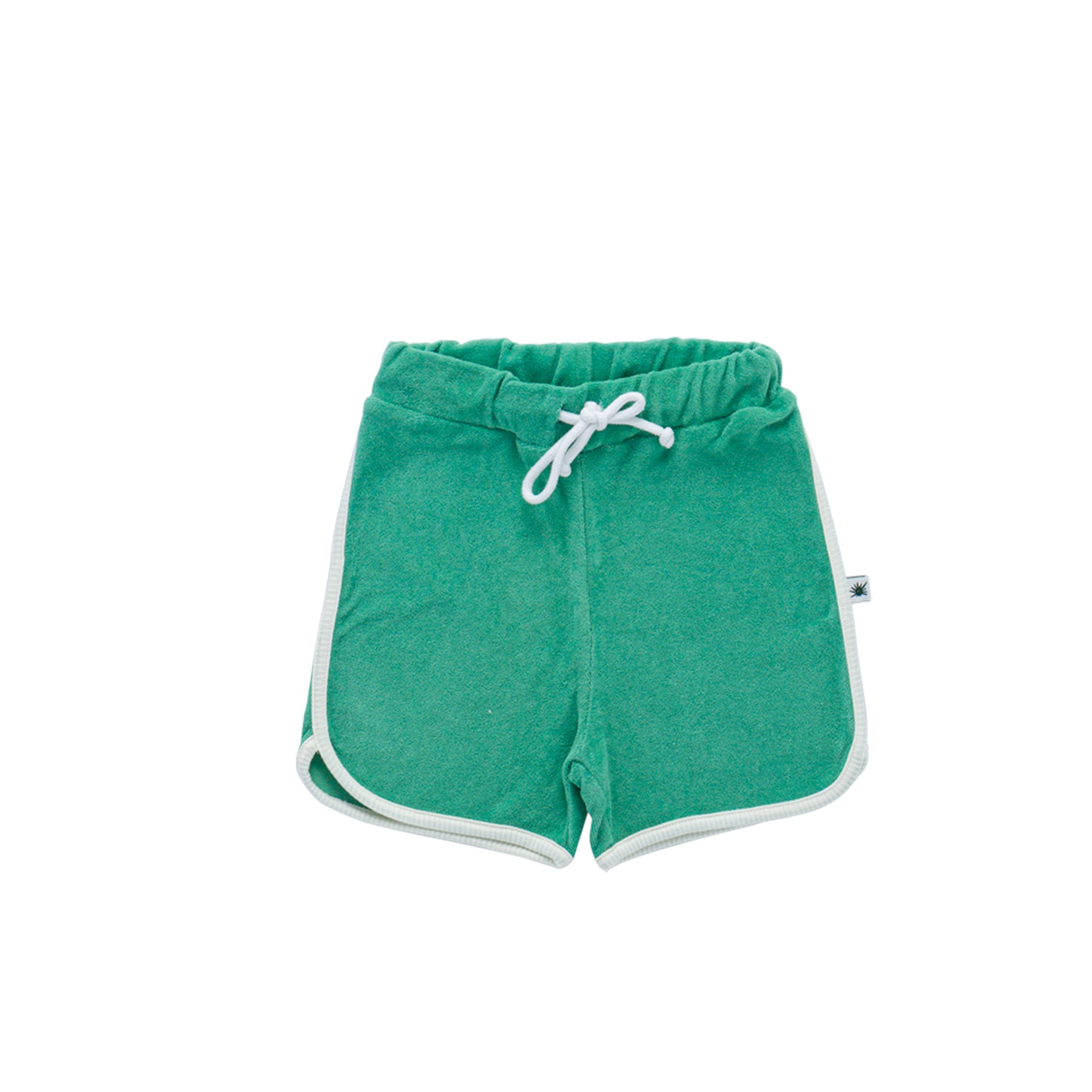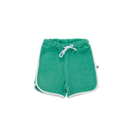 The retro style shorts are back in terry towel fabric with elastic waistband and cotton drawstring.
