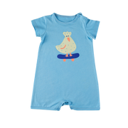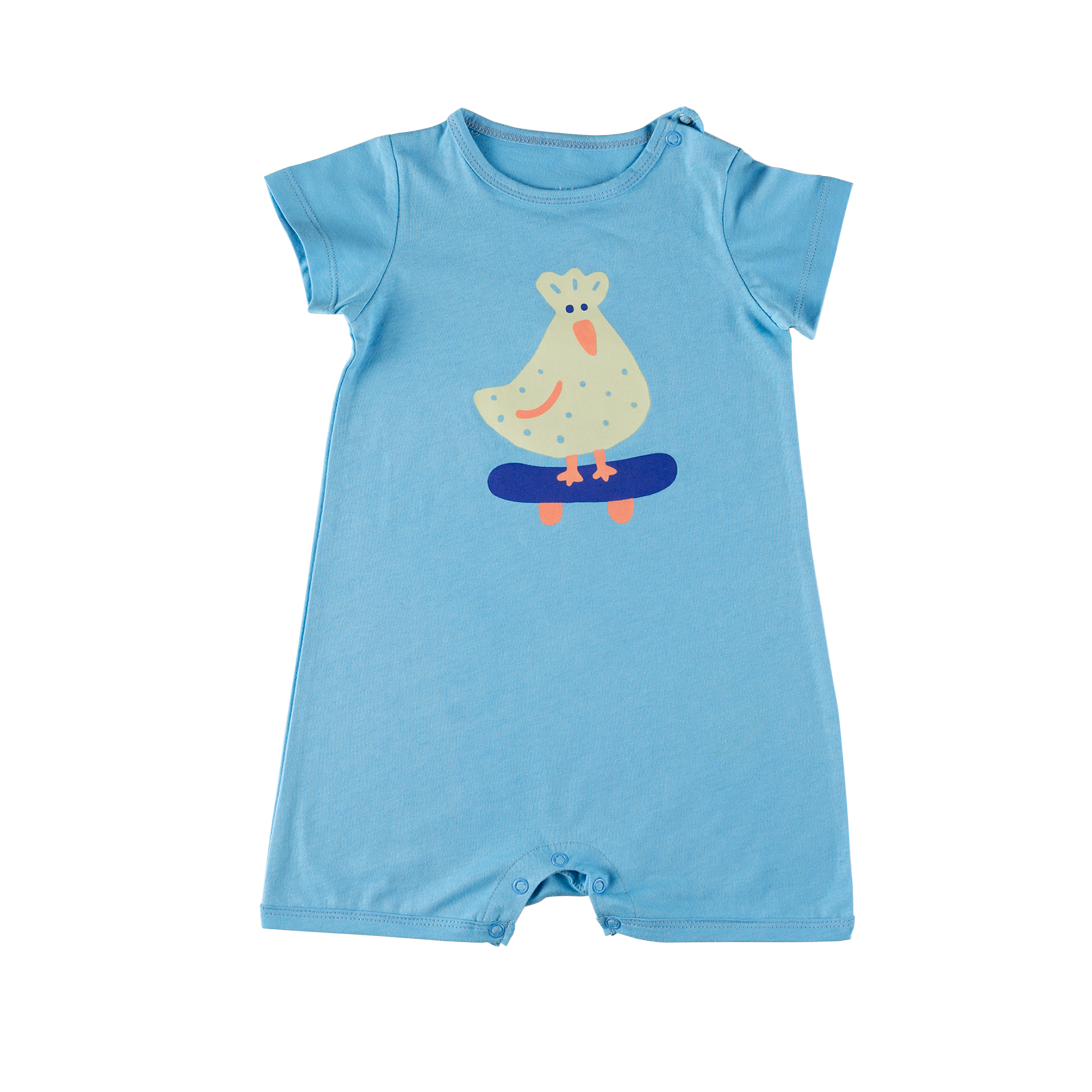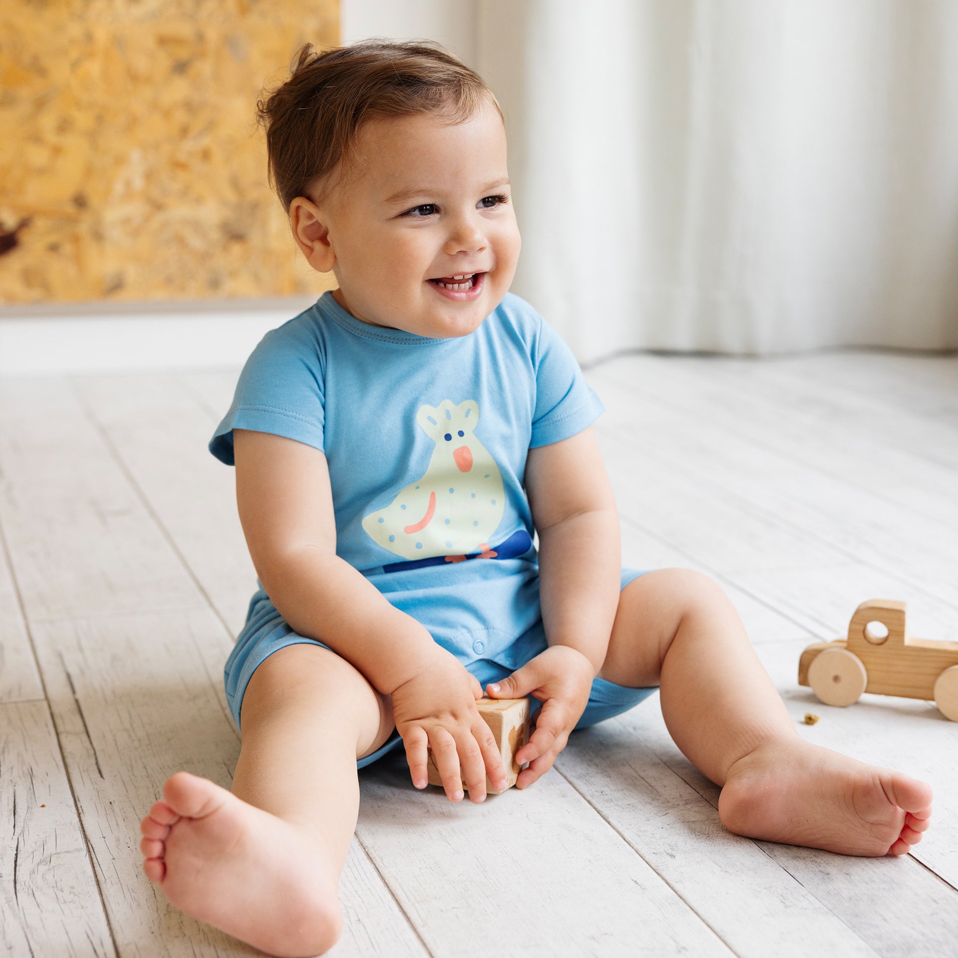 “Sunny” romper is from low-weight jersey fabric. It’s a summer favorite with short sleeves and inseam snaps and snaps on the shoulder.