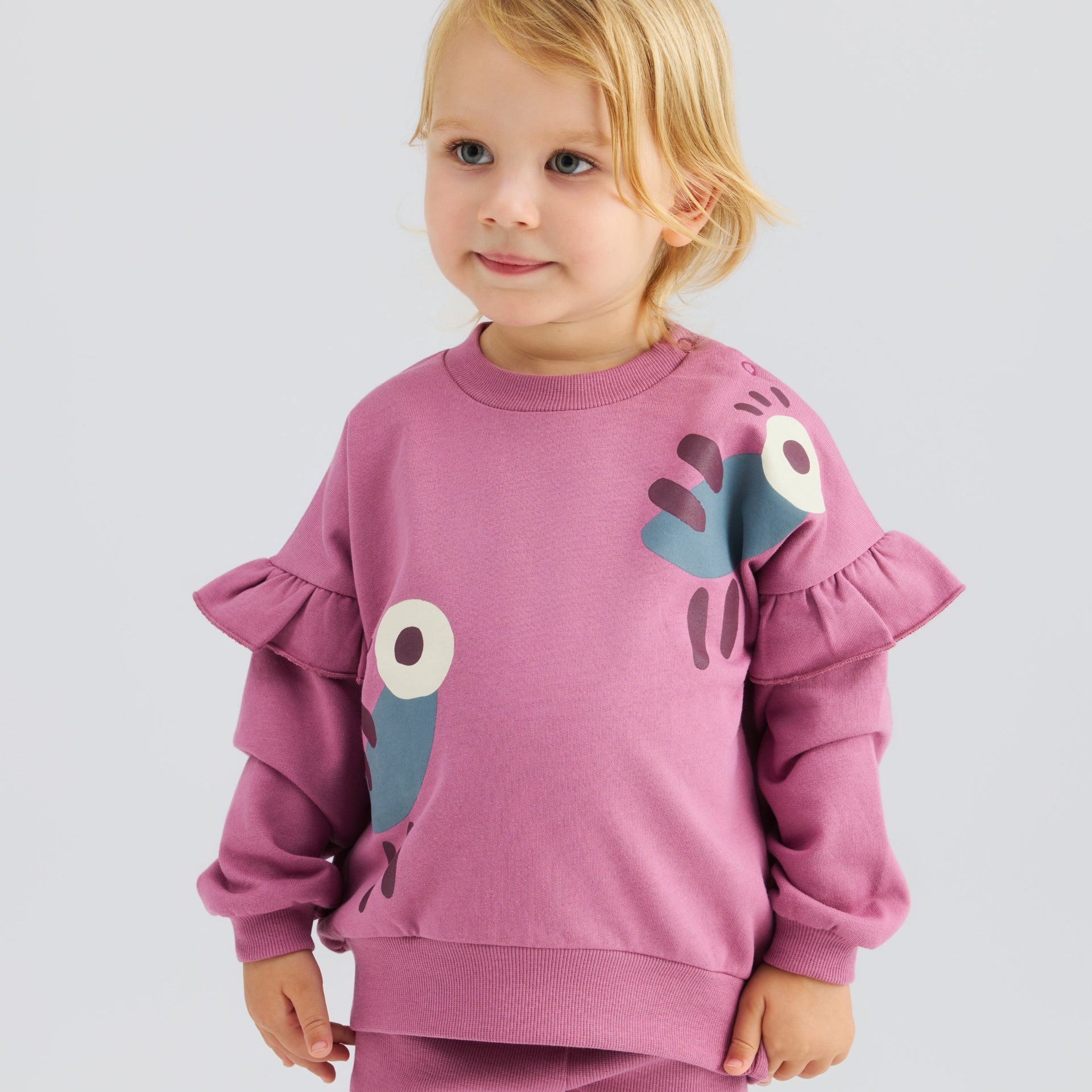 Geniş kesim, hafif kısa, fırfır detaylı sweatshirt. 3 yaşa kadar bedenlerde kolay giyim için omuzda çıtçıt bulunur.