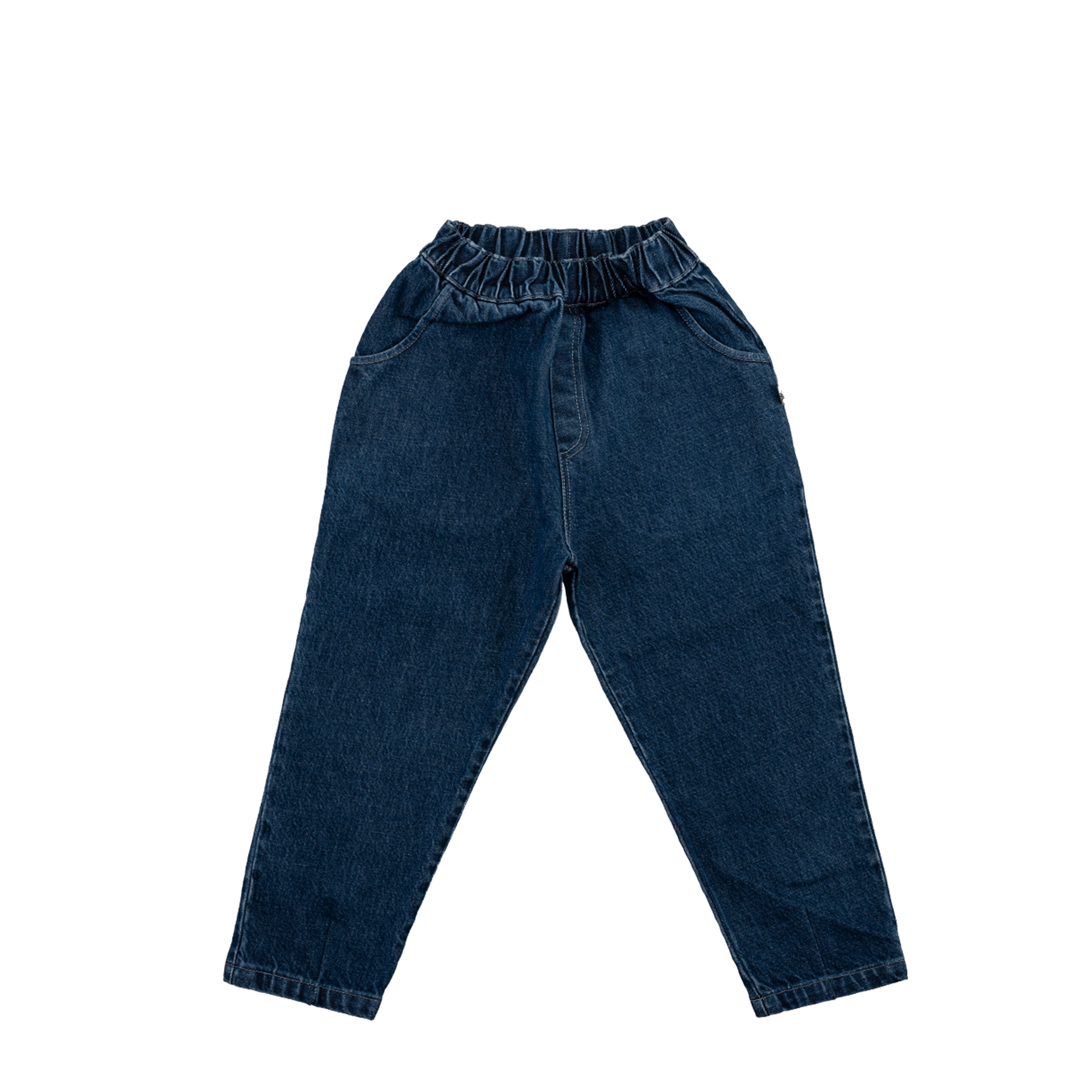Organik pamuk, geniş kesim, beli lastikli, yandan cepli denim pantolon. Bu modelin kalıbı biraz geniştir. Boyu paçaları kıvırarak rahatça ayarlanabilsin diye paça uçlarına dikiş detayları eklenmiştir.