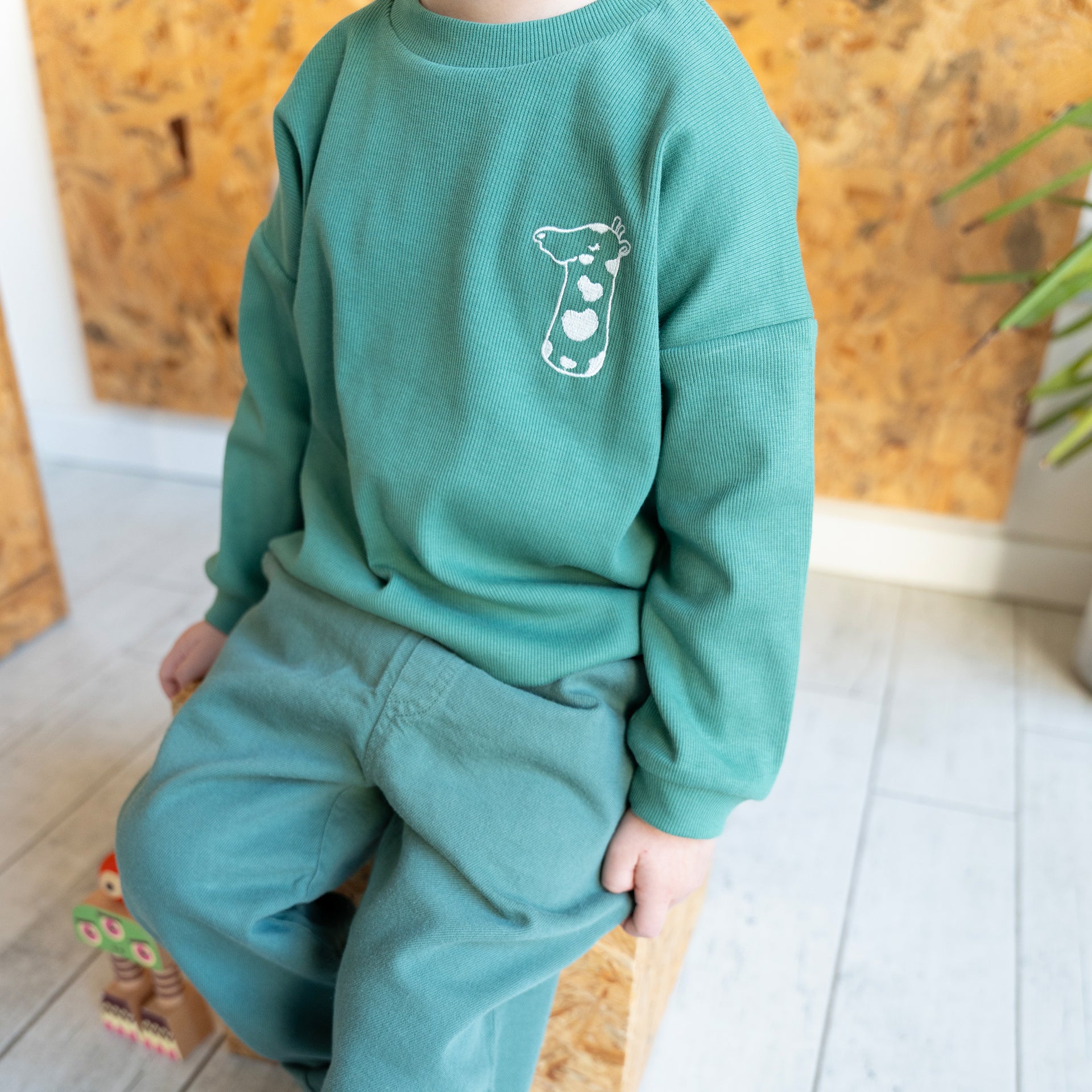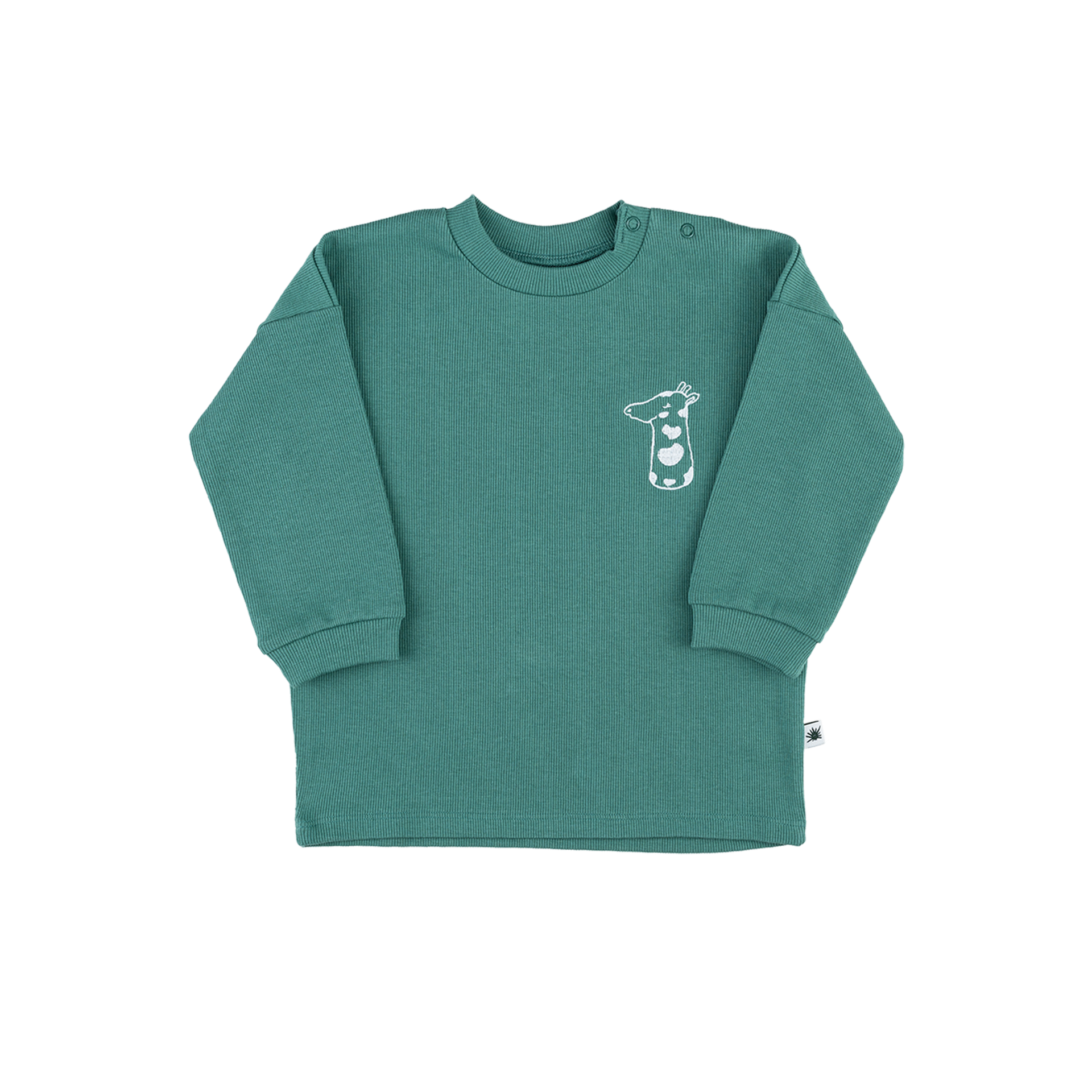 Bazılarına göre t-shirt, bazılarına göre ince bir sweatshirt... Aslında tam olarak geniş kesim, kaşkorse kumaştan uzun kollu, çok kullanışlı bir üst... Göğsünde bir zürafa nakışı bulunuyor. 1-2 yaş ve 2-3 yaş bedenlerde sol omuz üstünde kolay giyim için çıtçıtlar var. İster mevsimlik jogger pantolonlarla, isten ince denim pantolon, kanvas pantolon ya da  legginglerle giydirin. Aynı zamanda serin yaz günlerinde t-shirtler üzerine ince bir üst alarak alıp şortlarla tatlı takımlar da oluşturabilirsiniz.