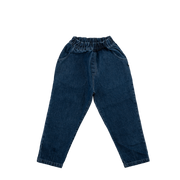 Organik pamuk, geniş kesim, beli lastikli, yandan cepli denim pantolon. Bu modelin kalıbı biraz geniştir. Boyu paçaları kıvırarak rahatça ayarlanabilsin diye paça uçlarına dikiş detayları eklenmiştir.