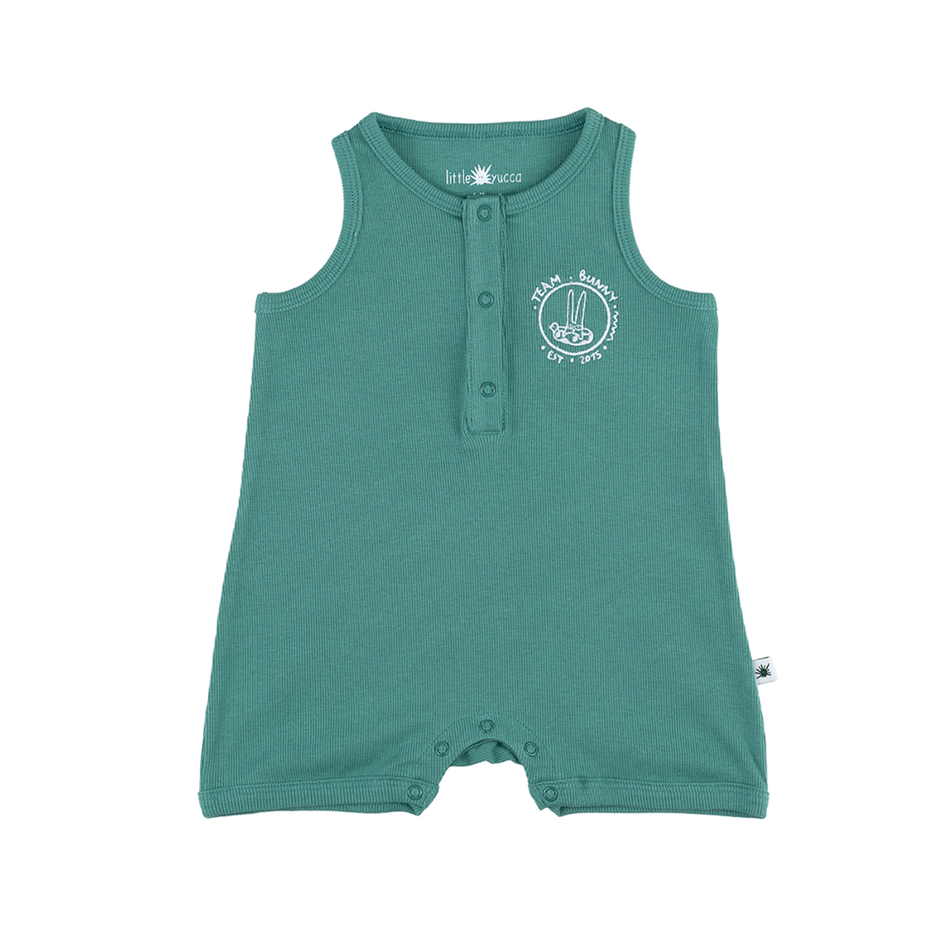 Kolsuz, önden çıtçıt ve göğüste nakış detaylı şort tulum. Kolay alt değişim için tüm bedenlerinde bacak içlerinde de çıtçıtlar bulunur.