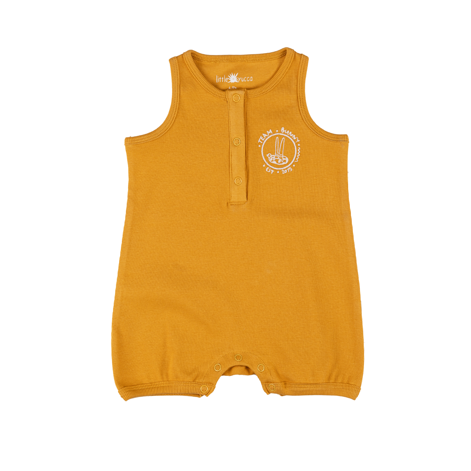 Kolsuz, önden çıtçıt ve göğüste nakış detaylı şort tulum. Kolay alt değişim için tüm bedenlerinde bacak içlerinde de çıtçıtlar bulunur.